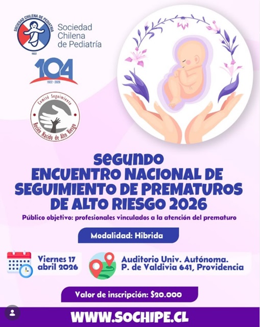 El Segundo Encuentro Nacional de Seguimiento de Prematuros de alto riesgo 2026 se realizará el 17 de abril de 2026 en modalidad híbrida. La sede presencial será el Auditorio de la Universidad Autónoma de Chile, ubicado en Av. Pedro de Valdivia 641, Providencia. La actividad está orientada a profesionales vinculados a la atención del prematuro y se difunde a través de la Sociedad Chilena de Pediatría.Fecha