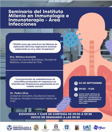 El Instituto Milenio en Inmunología e Inmunoterapia (IMII) invita al Seminario del Área de Infecciones, a realizarse el jueves 4 de septiembre de 2025 en el Salón Sazié, Edificio Decanato, Facultad de Medicina, Universidad de Chile (Av. Independencia 1027, Metro Hospitales). La jornada comienza con una bienvenida y café de cortesía a las 09:00, para iniciar el seminario entre 09:30 y 11:00 horas. Se presentarán dos conferencias: 1) “DDX3X como eje central en las fábricas de replicación del virus respiratorio sincicial: explorando su rol y valor terapéutico”, a cargo de la Dra. Mónica Acevedo (Instituto de Ciencias Biomédicas, Facultad de Medicina, Universidad de Chile); y 2) “Caracterización de subpoblaciones de neutrófilos producidos en respuesta a la infección por Streptococcus pneumoniae en un modelo murino”, por el Dr. Pedro Silva (Unidad de Citometría, Facultad de Ciencias Biológicas, Pontificia Universidad Católica de Chile). La actividad, coordinada por el Dr. Ricardo Soto, busca promover el intercambio científico sobre mecanismos de patogénesis viral y bacteriana, dianas terapéuticas emergentes y respuestas inmunes innatas. Contacto: inmunologiaeinmunoterapia@imii.cl.Fecha