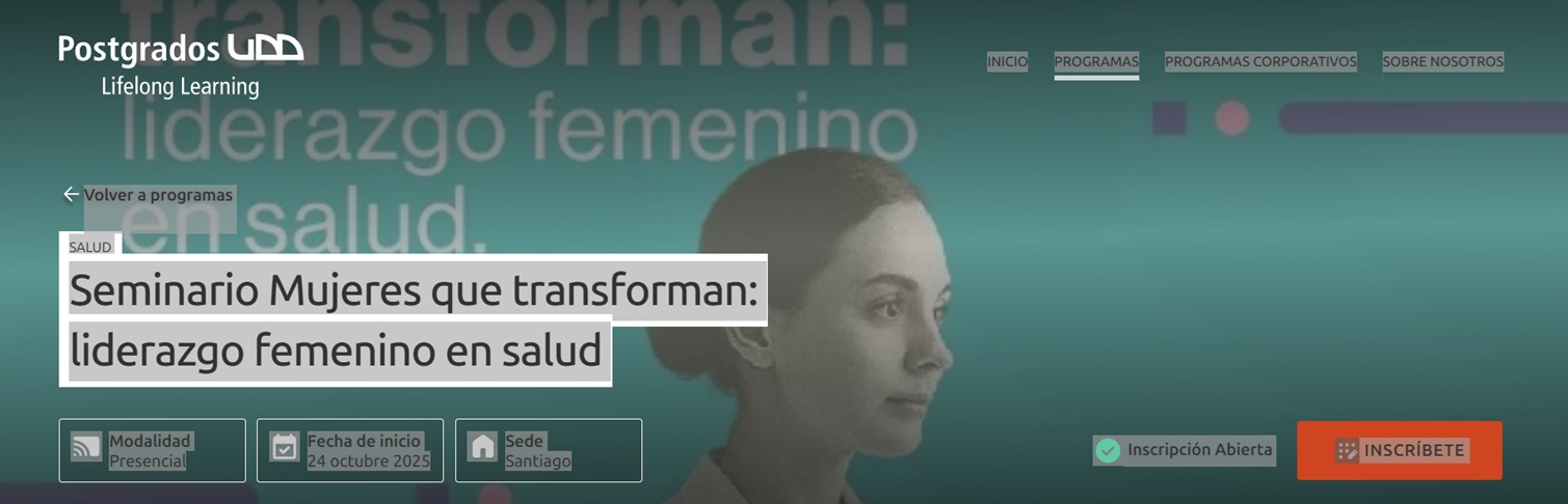Actividad organizada por la Facultad de Medicina Clínica Alemana - Universidad del Desarrollo que convoca a destacadas voces internacionales y nacionales para reflexionar sobre el papel de las mujeres en la transformación del sector salud. El seminario propone un espacio de encuentro e inspiración para líderes de instituciones sanitarias y educativas, con el fin de compartir experiencias, buenas prácticas y desafíos en materias de gestión, investigación, formación y servicio. Entre sus objetivos destaca fortalecer el liderazgo femenino en hospitales, clínicas y universidades, promoviendo entornos inclusivos que favorezcan el desarrollo de carrera, la corresponsabilidad y la toma de decisiones con perspectiva de género. Dirigido a la comunidad universitaria, líderes del sector salud y sociedad civil, el encuentro se realizará en modalidad presencial el viernes 24 de octubre de 2025, entre las 14:30 y 17:00 horas, en la Sede Santiago (Av. Plaza 680, Las Condes). La inscripción se gestiona mediante el sitio oficial de Postgrados UDD y el contacto de coordinación es anaramirez@udd.cl. El programa contempla presentaciones y conversación con invitadas/os internacionales.Fecha