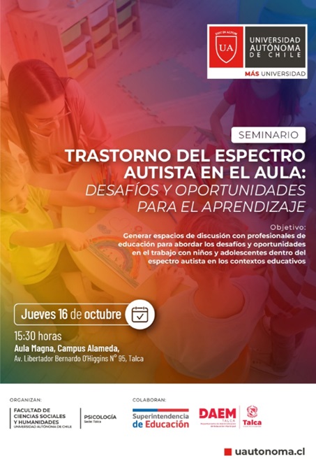 La Universidad Autónoma de Chile (Sede Talca) invita al seminario presencial “Trastorno del Espectro Autista en el Aula: desafíos y oportunidades para el aprendizaje”. El objetivo es generar un espacio de discusión con profesionales de la educación para abordar retos y oportunidades en el trabajo con niños y adolescentes dentro del espectro autista en contextos educativos. Actividad gratuita, en Aula Magna Campus Alameda (Av. Libertador Bernardo O’Higgins 95, Talca).Fecha
