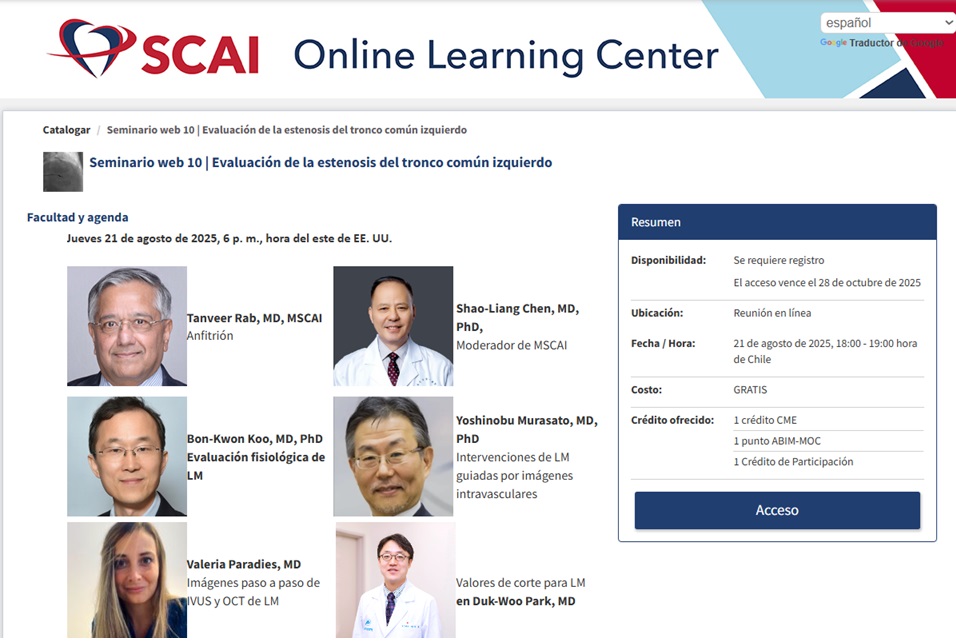 Seminario web SCAI enfocado en la evaluación y tratamiento de la estenosis del tronco común izquierdo, con ponencias internacionales sobre fisiología, imágenes intravasculares, técnicas intervencionistas y escenarios clínicos complejos como shock cardiogénico y STEMI. Fecha: Jueves 21 de agosto de 2025 Hora: 18:00 (hora del este de EE.UU.) Modalidad: Virtual Duración: 1 hora.Fecha