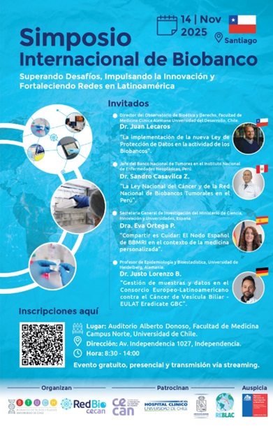 El Simposio Internacional de Biobancos reunirá a referentes de Chile y Latinoamérica para analizar el rol de los biobancos en investigación traslacional, regulación y cooperación interinstitucional. La jornada se realizará el viernes 14 de noviembre de 2025, de 08:30 a 14:00, en el Auditorio Alberto Donoso (Independencia 1027, Piso 2), Facultad de Medicina de la Universidad de Chile. El encuentro busca compartir experiencias sobre gobernanza, protección de datos, calidad y estandarización de procesos, así como identificar brechas regionales que permitan fortalecer redes colaborativas. Participan especialistas que abordarán marcos regulatorios nacionales y comparados, gestión de muestras y datos, y la articulación de nodos en medicina personalizada. Actividad gratuita, con opción presencial y transmisión vía streaming. Organizan el Biobanco de Tejidos y Fluidos de la Universidad de Chile y la Red de Biobancos CECAN. Contacto: ncandia@hcuch.cl.Fecha