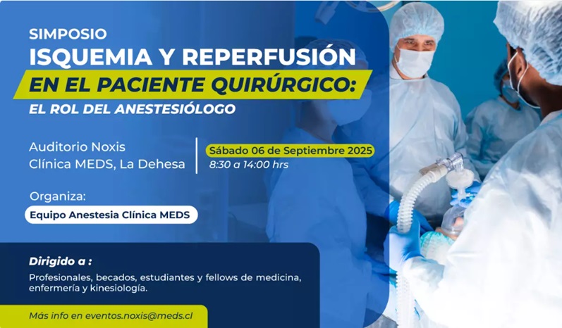 SIMPOSIO ISQUEMIA Y REPERFUSIÓN EN EL PACIENTE QUIRÚRGICO: EL ROL DEL ANESTESIÓLOGO 📍 Auditorio Noxis Clínica MEDS, La Dehesa 🗓 Sábado 06 de Septiembre 2025 ⏰ 8:30 a 14:00 hrs Organiza: Equipo Anestesia Clínica MEDS Dirigido a: Profesionales, becados, estudiantes y fellows de medicina, enfermería y kinesiología. Más info en eventos.noxis@meds.clFecha