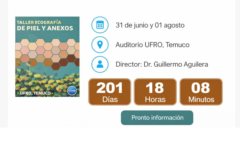 El Taller de Ecografía de Piel y Anexos se realizará los días 31 de julio y 1 de agosto de 2026 en el Auditorio UFRO, Temuco, Chile, y contará con la dirección del Dr. Guillermo Aguilera. Esta actividad presencial, incluida en la programación 2026 de SOCHRADI, está orientada a radiólogos, residentes y profesionales de la salud interesados en el estudio ecográfico de la piel, el tejido subcutáneo y sus anexos, con un enfoque práctico para el reconocimiento anatómico, la técnica de adquisición y la interpretación de hallazgos frecuentes y relevantes para la clínica. El taller busca fortalecer competencias para diferenciar patologías benignas y sospechosas, optimizar la evaluación dirigida y mejorar la correlación imagenológica con el contexto clínico. Para conocer el programa definitivo, contenidos, horarios, requisitos, valores y el proceso de inscripción, revisa el enlace oficial del evento en el sitio de SOCHRADI.Fecha