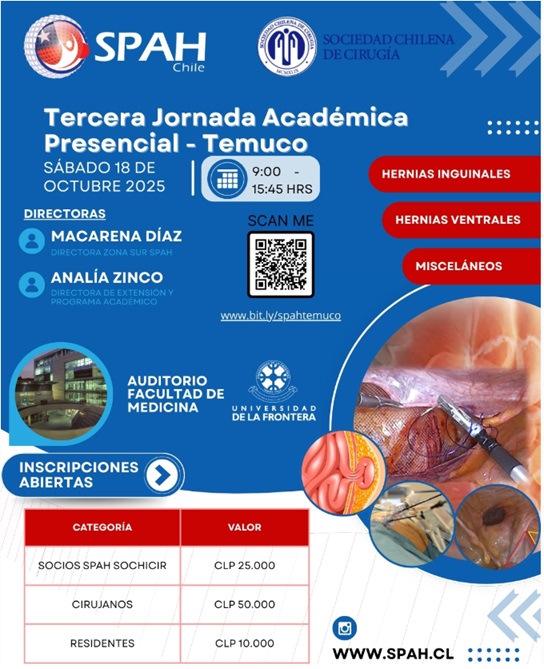 La Sociedad de Pared Abdominal de Chile (SPAH), con apoyo de la Sociedad Chilena de Cirugía, realiza en Temuco la tercera Jornada Académica Presencial centrada en hernias inguinales y ventrales, más un módulo de temas misceláneos de alto impacto en la práctica quirúrgica diaria. La actividad se llevará a cabo el sábado 18 de octubre de 2025, de 09:00 a 15:45 horas, en el Auditorio de la Facultad de Medicina de la Universidad de La Frontera. El programa combina actualización anatómica, técnicas abiertas y laparoscópicas (Lichtenstein, TEP, TAPP, Rives–Stoppa), algoritmos de decisión y discusión de complicaciones y dolor crónico. Además, incorpora aspectos funcionales y de rehabilitación con participación de kinesiología. Dirigido a cirujanos, residentes y equipos quirúrgicos interesados en pared abdominal, con tarifas diferenciadas para socios SPAH–SOCHICIR, cirujanos y residentes. Inscripciones: https://bit.ly/spahtemuco (según afiche).Fecha