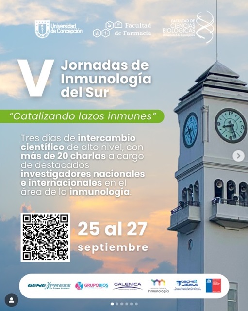 Las V Jornadas de Inmunología del Sur se realizarán del 25 al 27 de septiembre de 2025 en la Universidad de Concepción. Bajo el lema “Catalizando lazos inmunes”, el encuentro reúne a más de 20 conferencistas nacionales e internacionales para tres días de intercambio científico de alto nivel. El programa incluye simposios sobre interacción huésped-patógeno, epitelio como portería del sistema inmune, asma severa en modelo equino, transferencia mitocondrial e inmunometabolismo, además de charlas de cierre y premiación de pósteres. Entre los temas destacan microbioma pulmonar, exosomas, bioenergética mitocondrial en neutrófilos, linfáticos meníngeos y neuroinflamación, y vigilancia de centinelas inmunes. El objetivo central es fortalecer redes, actualizar evidencia y promover la formación avanzada en inmunología básica, clínica y traslacional en la macrozona sur del país.Fecha