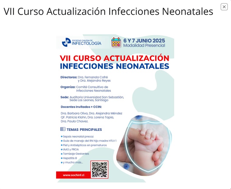 VII Curso Actualización Infecciones Neonatales 6 y 7 junio 2025 – Modalidad presencial Directoras: Dra. Fernanda Cofré y Dra. Alejandra Reyes Organiza: Comité Consultivo de Infecciones Neonatales Sede: Auditorio Universidad San Sebastián, sede Los Leones, Santiago Docentes invitados + CCIN: Dra. Bárbara Oliva Dra. Alejandra Méndez QF. Patricia Klahn Dra. Lorena Tapia Dra. Paula Chávez Temas principales Sepsis neonatal precoz Guía de manejo del RN hijo madre HTLV-1 Piel y antisépticos en prematuros IAAS y PROA Tamizaje gestantes Hepatitis B … y mucho más www.sochinf.clFecha