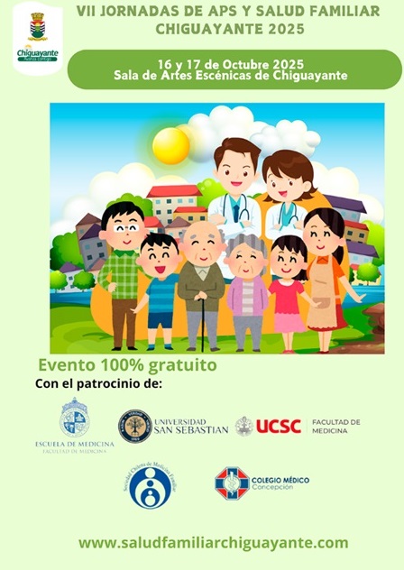 Las VII Jornadas de APS y Salud Familiar se realizarán los días 16 y 17 de octubre de 2025 en la Sala de Artes Escénicas de Chiguayante, ubicada en calle Orozimbo Barbosa 294. La actividad es gratuita y considera modalidad presencial con alternativas de conexión en línea, convocando a equipos de atención primaria, académicos y estudiantes. El programa del primer día contempla inscripción, inauguración y conferencias sobre toma de decisiones compartidas en salud, la trayectoria de Coaniquem en el manejo de quemaduras pediátricas, brechas de inequidad tras el examen de medicina preventiva de adultos en APS, sedación paliativa en atención primaria, el nuevo marco regulatorio de licencias médicas y estrategias para promover la salud pélvica de la mujer, con espacios de café y recesos programados. La segunda jornada aborda el rol de los proveedores de salud en la prevención de la injuria en niños pasajeros, interpretación del Holter de presión arterial, el aporte de la Sociedad Chilena de Medicina Familiar a la salud pública del país, enfoque epidemiológico de riesgo en la APS chilena, programa de integración escolar, paciente empoderado en la formación universitaria y zoonosis frecuentes en Chile, cerrando con instancia de síntesis. La actividad cuenta con patrocinio de instituciones universitarias y sociedades científicas del ámbito de la salud familiar y comunitaria. Más información e inscripciones en el sitio oficial saludfamiliarchiguayante.com.Fecha
