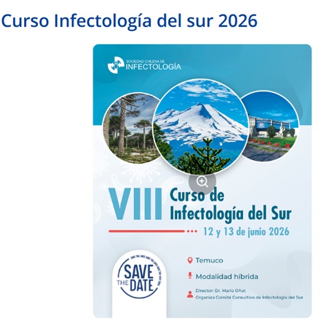 El VIII Curso de Infectología del Sur 2026 se realizará los días 12 y 13 de junio de 2026 en Temuco, en modalidad híbrida. La actividad es organizada por SOCHINF y por el Comité Consultivo de Infectología del Sur, y será dirigida por el Dr. Mario Oñate. El curso busca reunir a profesionales de la salud y especialistas en infectología para actualizar conocimientos, compartir experiencias clínicas y fortalecer la discusión sobre enfermedades infecciosas relevantes para la macrozona sur del país.Fecha