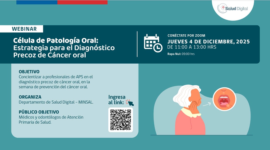 Webinario organizado por el Departamento de Salud Digital (MINSAL) para concientizar a profesionales de APS en el diagnóstico precoz de cáncer oral, en el marco de la semana de prevención del cáncer oral. Fecha: Jueves 4 de diciembre de 2025. Horario: 11:00 a 13:00 (Rapa Nui 09:00). Plataforma: Zoom. Público objetivo: médicos y odontólogos de Atención Primaria de Salud.Fecha