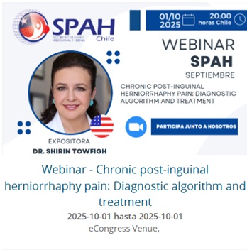 La Sociedad de Pared Abdominal de Chile (SPAH) invita al webinar ‘Chronic post-inguinal herniorrhaphy pain: Diagnostic algorithm and treatment’, a cargo de la Dra. Shirin Towfigh (Estados Unidos), reconocida especialista en hernias y una de las pocas cirujanas en EE. UU. dedicadas al tratamiento de hernias de la pared abdominal, flanco, espalda y suelo pélvico. Obtuvo su licenciatura con honores en UCLA y su doctorado en medicina en UC San Diego; completó su formación quirúrgica e investigación en UCLA. Está certificada en Cirugía General por la Junta Americana de Cirugía y la Junta Europea de Cirugía. En esta sesión se revisarán definición y clasificación del dolor crónico posherniorrafia inguinal, evaluación clínica estructurada, diagnóstico diferencial, red flags, rol de la imagenología (ecografía, TC y RM), y un algoritmo terapéutico escalonado que incluye manejo analgésico, bloqueos nerviosos, neurectomía, revisión de malla y opciones de reoperación. Actividad online (eCongress Venue). No socios: CLP 20.000 (22 USD).Fecha