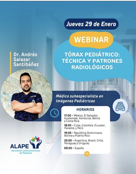 Webinar gratuito "TÓRAX PEDIÁTRICO: TÉCNICA Y PATRONES RADIOLÓGICOS", organizado por la Asociación Latinoamericana de Pediatría (ALAPE). En esta actividad expondrá el Dr. Andrés Salazar Santibáñez, especialista en Imagenología Diagnóstica y Terapéutica, subespecialista en Radiología Pediátrica (Pontificia Universidad Católica de Chile), Presidente de la Rama de Imagenología de la Sociedad Chilena de Pediatría e integrante del Comité de Educación y Docencia de la Sociedad Latinoamericana de Radiología Pediátrica. El webinar revisa los principales patrones radiológicos en el tórax pediátrico y entrega herramientas para perfeccionar la mirada clínica en escenarios frecuentes y relevantes de la práctica pediátrica. Se realizará vía Zoom/streaming y requiere inscripción previa.Fecha