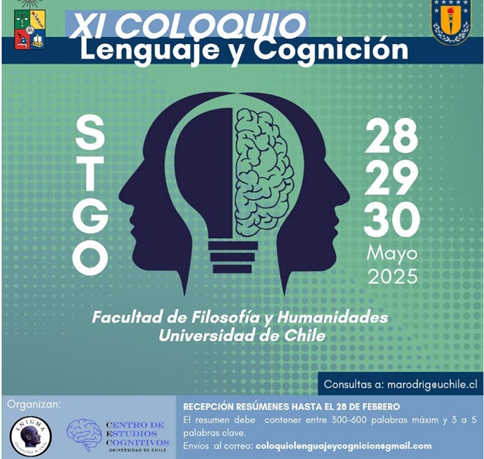 Convocatoria XI Coloquio Lenguaje y Cognición El Centro de Estudios Cognitivos de la Facultad de Filosofía y Humanidades de la Universidad de Chile convoca a la XI versión del Coloquio Lenguaje y Cognición, año 2025. Con esta actividad se retoma una oportunidad de encuentro para la comunidad académica interesada en los temas de Cognición y Lenguaje, iniciada por la Universidad de Concepción el año 2010. El plazo para el envío de resúmenes es hasta el 28 de febrero de 2025.Fecha