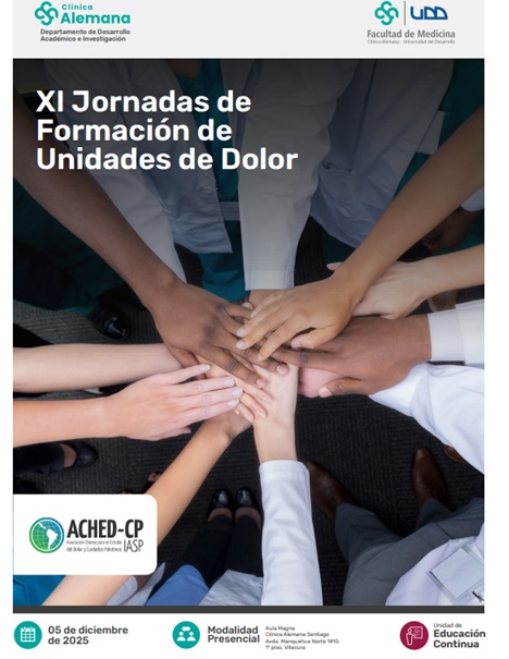 Las «XI Jornadas de Formación de Unidades de Dolor» son una actividad presencial organizada por Clínica Alemana Santiago, su Departamento de Desarrollo Académico e Investigación y la Facultad de Medicina Clínica Alemana – Universidad del Desarrollo, con el apoyo de ACHED-CP. La jornada se realizará el viernes 5 de diciembre de 2025 en el Aula Magna de Clínica Alemana, en Vitacura, y tiene como propósito promover el desarrollo, fortalecimiento y sostenibilidad de las unidades de dolor crónico en Chile. A través de conferencias, mesas redondas y presentaciones de experiencias locales, se revisan modelos de formación y estructuración de unidades de dolor, ciencias de la implementación, uso racional de fármacos y terapias intervencionales, medicina integrativa, enfoques sociales del dolor, gestión clínica, salud basada en valor, cobertura de procedimientos y líneas de investigación. El enfoque es interdisciplinario, seguro, basado en evidencia y centrado en la persona con dolor persistente, integrando la visión de médicos, kinesiólogos, enfermeros, psicólogos, odontólogos y otros profesionales de la salud.Fecha