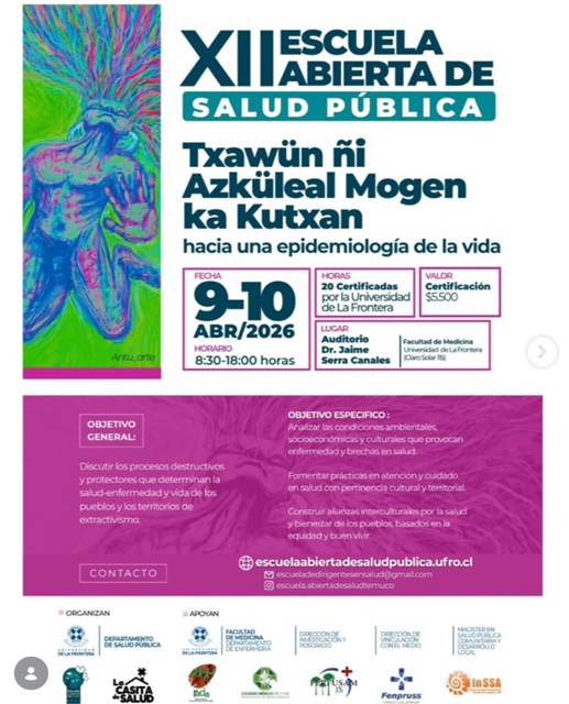 La XII Escuela Abierta de Salud Pública, organizada por el Departamento de Salud Pública de la Universidad de La Frontera y diversas organizaciones, se llevará a cabo los días 9 y 10 de abril de 2026 en el Auditorio Dr. Jaime Serra Canales de la Facultad de Medicina, en Temuco. Con el lema en mapudungun ‘Txawün ñi Azküleal Mogen ka Kutxan: hacia una epidemiología de la vida’, el encuentro propone un espacio de diálogo y formación que analiza los procesos destructivos y protectores que determinan la salud, la enfermedad y la vida de los pueblos frente a la crisis ecológica, social y cultural. El programa contemplará presentaciones de resultados de investigación, difusión de experiencias en salud colectiva, cursos y talleres presenciales, fomentando prácticas culturalmente pertinentes y la construcción colectiva de saberes. Quienes deseen presentar trabajos libres en formato de poster, cartel, curso o taller deben enviarlos hasta el 8 de marzo de 2026. El evento es abierto a toda la comunidad y ofrece certificación de 20 horas académicas, con un valor simbólico de $5.500 para la obtención del certificado. Las inscripciones y más información están disponibles a través de la cuenta @escuela.abiertadesaludtemuco.Fecha