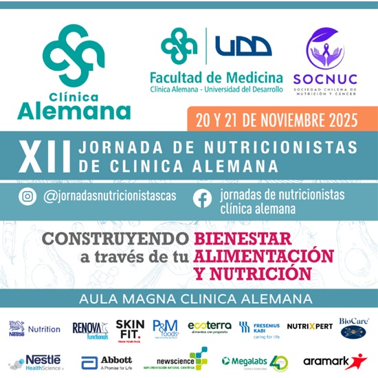 La XII Jornada de nutricionistas de Clínica Alemana es un encuentro académico y profesional de dos días que reúne a nutricionistas y equipos de salud interesados en las tendencias actuales de la nutrición clínica, la investigación aplicada y la práctica basada en evidencia. La versión 2025 combina modalidad presencial y online, facilitando la participación de asistentes desde distintas regiones y países. El programa contempla ponencias, discusión de casos y actualizaciones en evaluación nutricional, soporte nutricional en pacientes complejos, abordajes interdisciplinarios y buenas prácticas para la continuidad del cuidado. El comité organizador —integrado por Antonia Barahona, Pamela Díaz, Patricia Escobar, Mónica Garrido, Ma Fernanda Mackenna, Carolina Morales y Ma Esther Sciberras— ha diseñado una jornada dinámica con foco en pertinencia clínica y aplicabilidad inmediata. Las inscripciones están abiertas en modalidad presencial y online, con valores diferenciados y cupos limitados. La organización está a cargo de Clínica Alemana de Santiago y la plataforma de registro informa disponibilidad de tickets, métodos de pago y condiciones de acceso remoto. El objetivo es fortalecer competencias, compartir experiencias y promover el intercambio de conocimiento actualizado para la toma de decisiones nutricionales seguras y efectivas en los distintos niveles de atención.Fecha