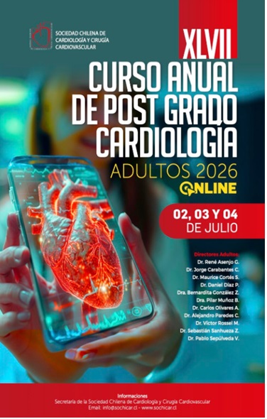 El XLVII Curso Anual de Postgrado Cardiología Adultos 2026 se desarrollará entre el 2 y el 4 de julio de 2026 en modalidad virtual. La actividad es organizada en el marco de la Sociedad Chilena de Cardiología y Cirugía Cardiovascular y busca actualizar conocimientos en cardiología de adultos mediante un programa de postgrado orientado a profesionales del área cardiovascular. El curso contará con la dirección de un equipo académico integrado por destacados especialistas nacionales.Fecha