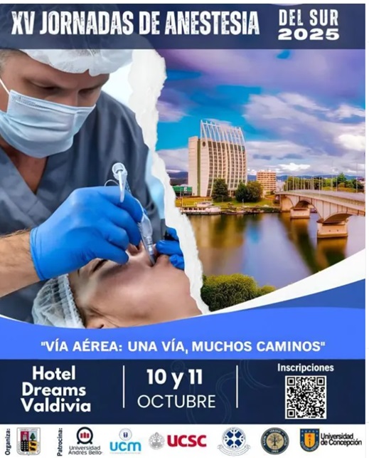 Las XV Jornadas de Anestesia del Sur se realizaran en Valdivia con el eje tematico Via aerea una via muchos caminos. El encuentro tendra sede en el Hotel Dreams Valdivia los dias 10 y 11 de octubre de 2025 e incluye talleres practicos el jueves 9 de octubre en el campus Isla Teja de la Universidad Austral de Chile. Se revisara evaluacion diagnostica y manejo de la via aerea en diversos escenarios clinicos con sesiones sobre videolaringoscopia, ultrasonido, obesidad morbida, pediatria y neuroanestesia, ademas de manejo fuera de pabellon y complicaciones. Participan docentes y especialistas de UACh, UFRO, UdeC, UCSC, UCM, UNAB y USS. Modalidad por estaciones para los talleres con entrenamiento en dispositivos supragloticos, laringoscopia directa, ultrasonido de via aerea, via aerea quirurgica, videolaringoscopios y fibrobroncoscopio. Organiza el equipo de Anestesia UACh. Informacion y registro en el sitio oficial.Fecha