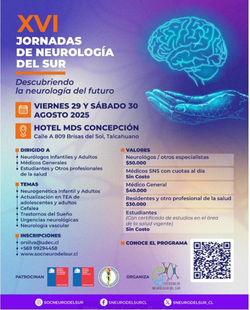 Las XVI Jornadas de Neurología del Sur, organizadas por la Sociedad de Neurología del Sur, se realizarán el 29 y 30 de agosto de 2025 en el Hotel Marina del Sol, Talcahuano, bajo el lema 'Descubriendo la Neurología del Futuro'. El evento está dirigido a estudiantes y profesionales de la salud, con un completo temario sobre genética, neurología infantil y adulta, trastornos del movimiento, epilepsia, neurocognición, urgencias neurológicas y simposios con la industria farmacéutica.Fecha