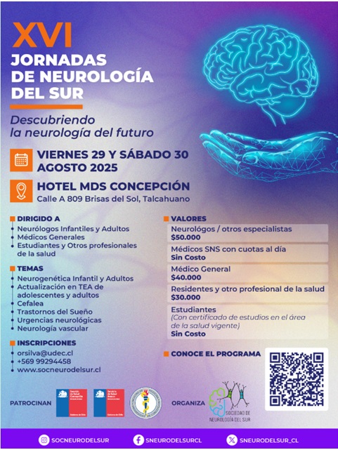 Las XVI Jornadas de Neurología del Sur se realizarán los días 29 y 30 de agosto de 2025 en el Hotel MDS Concepción, Talcahuano. Dirigidas a neurólogos infantiles y adultos, médicos generales, estudiantes y otros profesionales de la salud. Se abordarán temáticas como neurogenética, cefalea, trastornos del sueño, urgencias neurológicas, neurología vascular y TEA. El evento ofrece inscripciones gratuitas para médicos del SNS con cuotas al día y estudiantes, y aranceles diferenciados para otros asistentes.Fecha