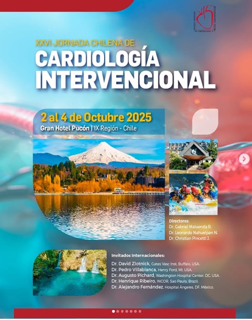 La XXVI Jornada Chilena de Cardiología Intervencional se realizará del 2 al 4 de octubre de 2025 en el Gran Hotel Pucón, IX Región de La Araucanía, Chile. Reúne a especialistas nacionales e invitados internacionales para abordar temas de alto impacto clínico en cardiología estructural y coronaria. El programa incluye módulos sobre lesiones calcificadas (CHIP1), bifurcaciones (CHIP2), válvula mitral, y una jornada dedicada a TAVI con discusión de casos en vivo desde hospitales regionales (Valdivia y Temuco), además de una plenaria inspiradora. El sábado se centra en tromboembolismo pulmonar (TEP) percutáneo, dispositivos innovadores (Lux Valve, DragonFly-M TEER, microcirculación coronaria) y paneles de discusión. Directores: Dres. Gabriel Maluenda R., Leonardo Nahuelpan N. y Christian Pincetti J. Invitados internacionales: Dres. David Zlotnick (Buffalo, USA), Pedro Villablanca (Henry Ford, USA), Augusto Pichard (Washington Hospital Center, USA), Henrique Ribeiro (INCOR, São Paulo, Brasil) y Alejandro Fernández (Hospital Ángeles, México).Fecha