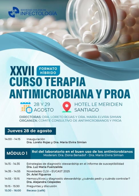Curso híbrido (presencial + online sincrónico) de la Sociedad Chilena de Infectología (SOCHINF) para equipos clínicos y miembros PROA. Incluye estrategias de Diagnostic Stewardship, manejo de bacilos gramnegativos resistentes a carbapenémicos, optimización de terapia antimicrobiana y actualización en antifúngicos/antivirales/antiparasitarios. Certificación 20 h académicas.Fecha