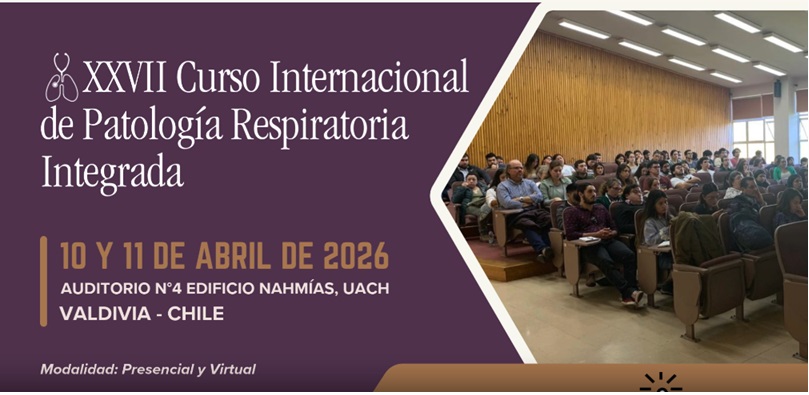 El XXVII Curso Internacional de Patología Respiratoria Integrada se realizará los días 10 y 11 de abril de 2026 en Valdivia, Chile, en modalidad presencial y virtual. El encuentro reúne a docentes internacionales, nacionales y locales para abordar temas de patología respiratoria en adultos y niños.Fecha