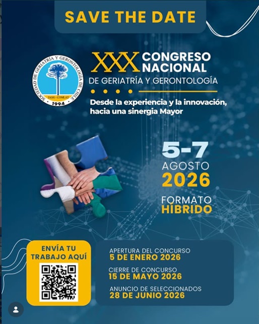 El XXX Congreso Nacional de Geriatría y Gerontología se realizará del 5 al 7 de agosto de 2026 en formato híbrido, combinando asistencia presencial y online. Esta nueva edición se presenta bajo el lema 'Desde la experiencia y la innovación, hacia una sinergia mayor', proponiendo un espacio de encuentro académico orientado al envejecimiento saludable, la atención integral de las personas mayores y los desafíos clínicos, sociales y organizacionales de la geriatría y la gerontología. La convocatoria contempla además recepción de trabajos científicos, con apertura del concurso el 5 de enero de 2026, cierre el 15 de mayo de 2026 y anuncio de seleccionados el 28 de junio de 2026. La organización informa que el lugar exacto, los valores de inscripción y mayores detalles serán comunicados próximamente. El congreso está dirigido a profesionales de la salud, académicos, investigadores y equipos interdisciplinarios vinculados al cuidado de personas mayores.Fecha