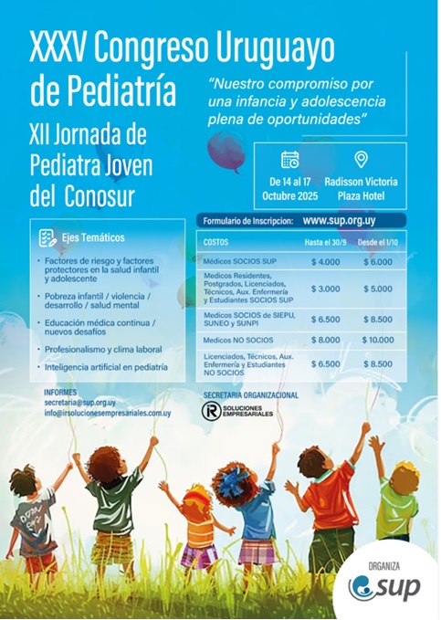 El XXXV Congreso Uruguayo de Pediatría y la XII Jornada de Pediatra Joven del Conosur se celebran del 14 al 17 de octubre de 2025 en el Radisson Victoria Plaza Hotel, Montevideo. El evento conmemora los 110 años de la Sociedad Uruguaya de Pediatría, reuniendo pediatras de todo el país y la región en torno al lema 'Nuestro compromiso por una infancia y adolescencia plena de oportunidades'. El Congreso fomenta la actualización profesional, el intercambio de experiencias exitosas y la integración de equipos de salud. Las jornadas para jóvenes pediatras refuerzan la participación activa de nuevas generaciones en la investigación y defensa de la infancia. Ejes temáticos: factores de riesgo y protección en salud infantil, pobreza, violencia, desarrollo, salud mental, educación médica continua, inteligencia artificial, profesionalismo y clima laboral.Fecha